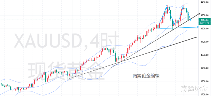 日内来说呢,就是所谓的“双顶”。关注一下4380一带的前高得失,始终在其下,那就至少是区间运行,下方4205—4185为颈线,失守后才是双顶成立,这在大周期上是可以参考的。